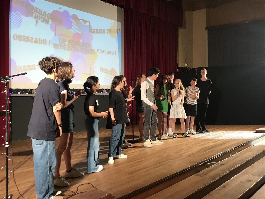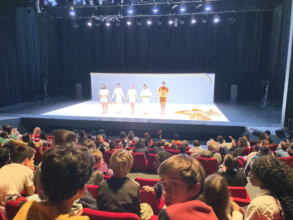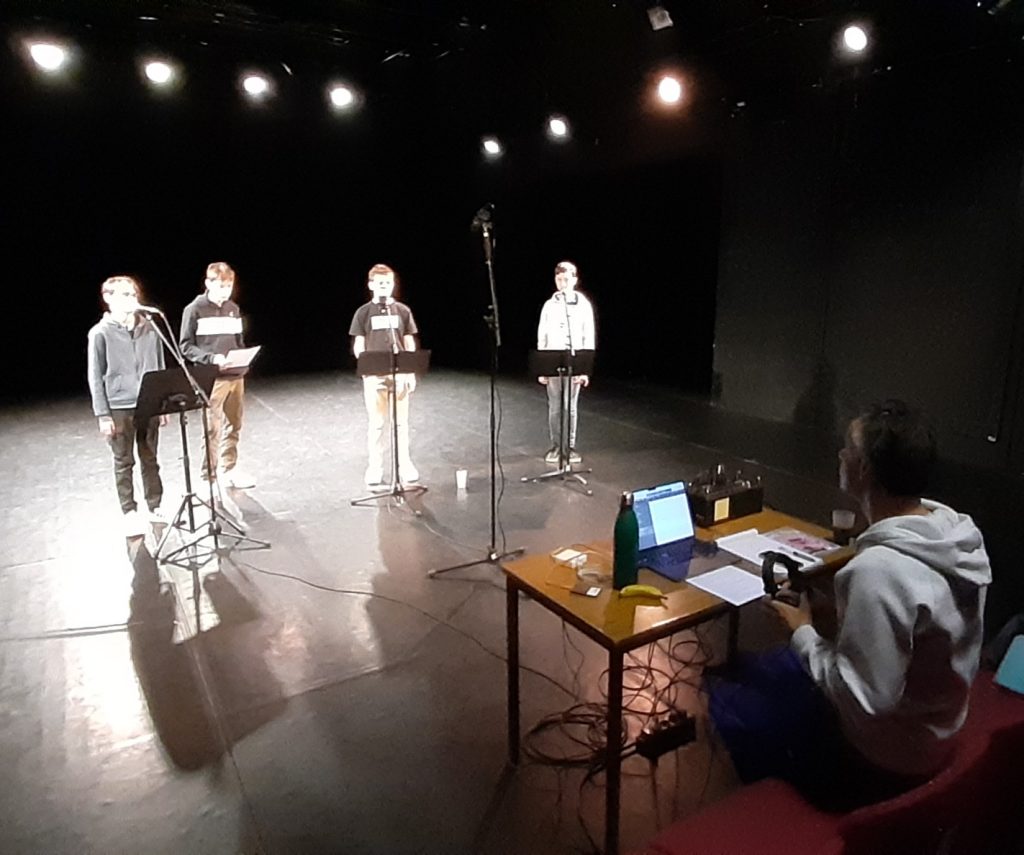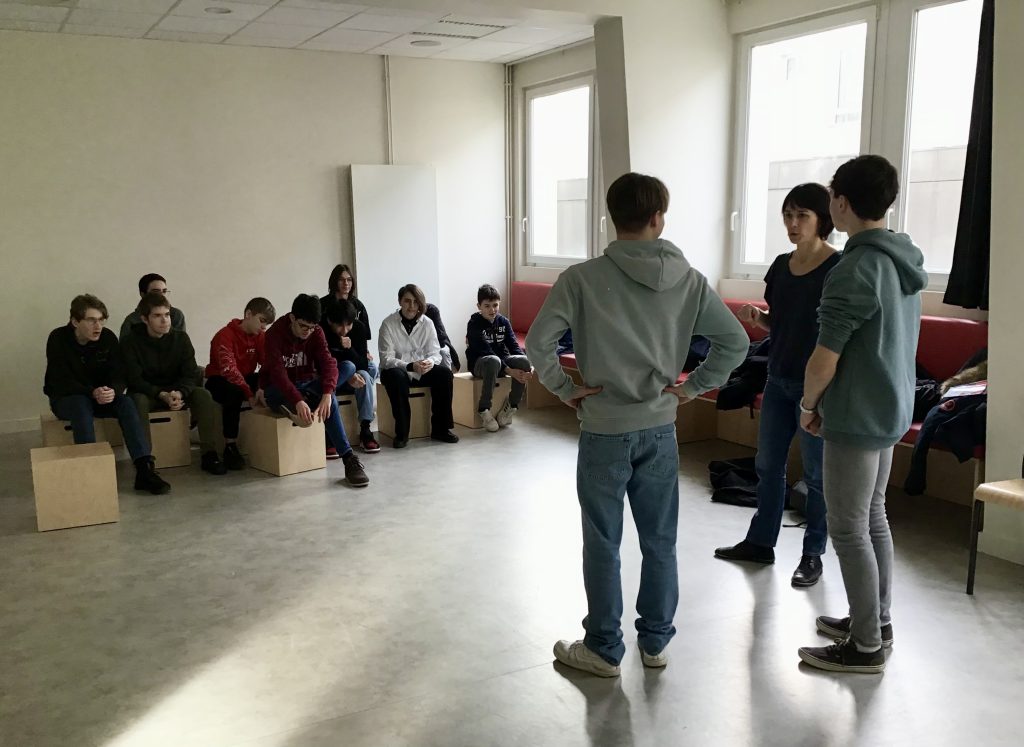 La restitution du travail de l’année des 4C concernant le projet « Mettre en ondes » mené en collaboration avec la compagnie Biche Prod et le Nouveau Studio Théâtre de Nantes a eu lieu le vendredi 24 mai sur le plateau du Théâtre.