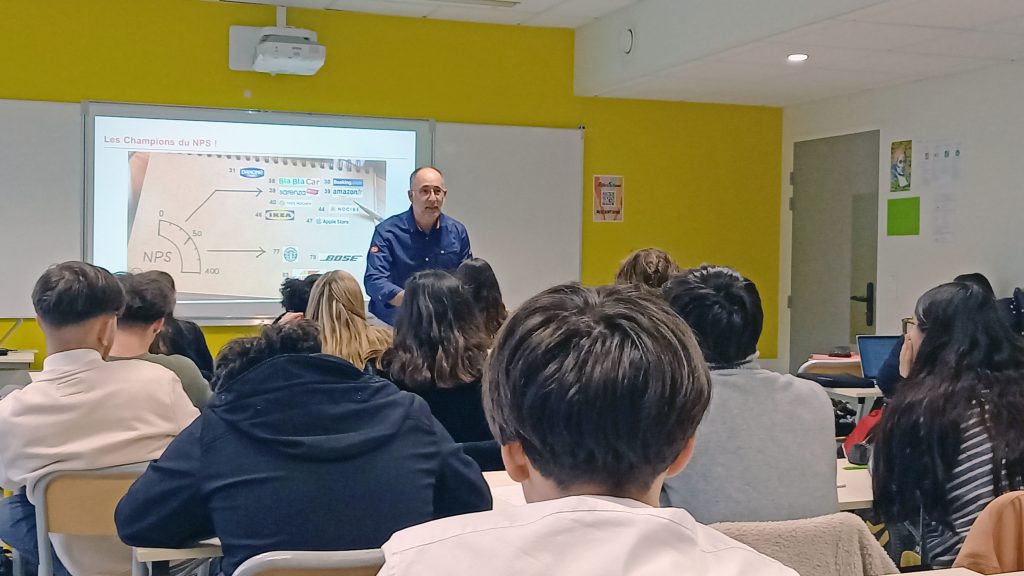 Mercredi 13 novembre, M. Pacaud, directeur de Boulanger Paridis, est intervenu auprès des élèves de Terminale BAC Pro Métiers du Commerce et de la Vente Option A (TMCVA) et T MCVA Nouveau Départ pour leur expliquer l’importance et le fonctionnement des enquêtes NPS (Net Promoter Score).
