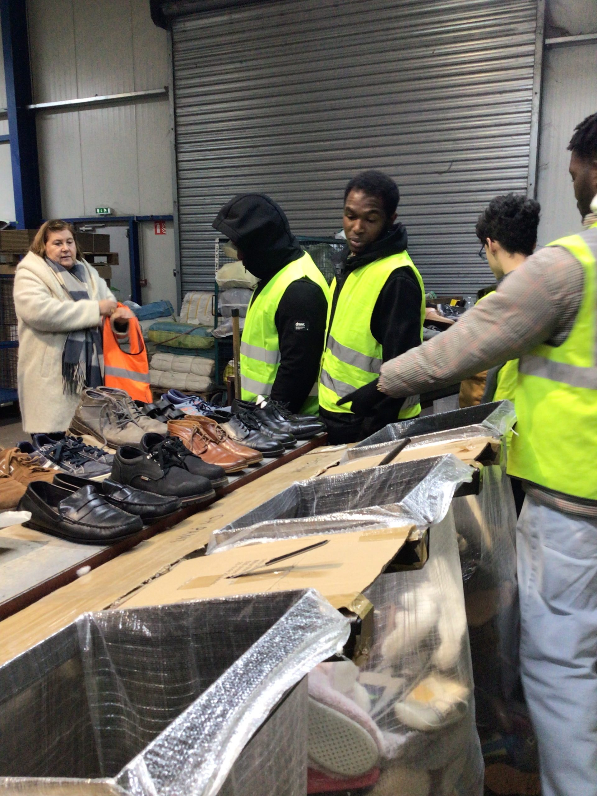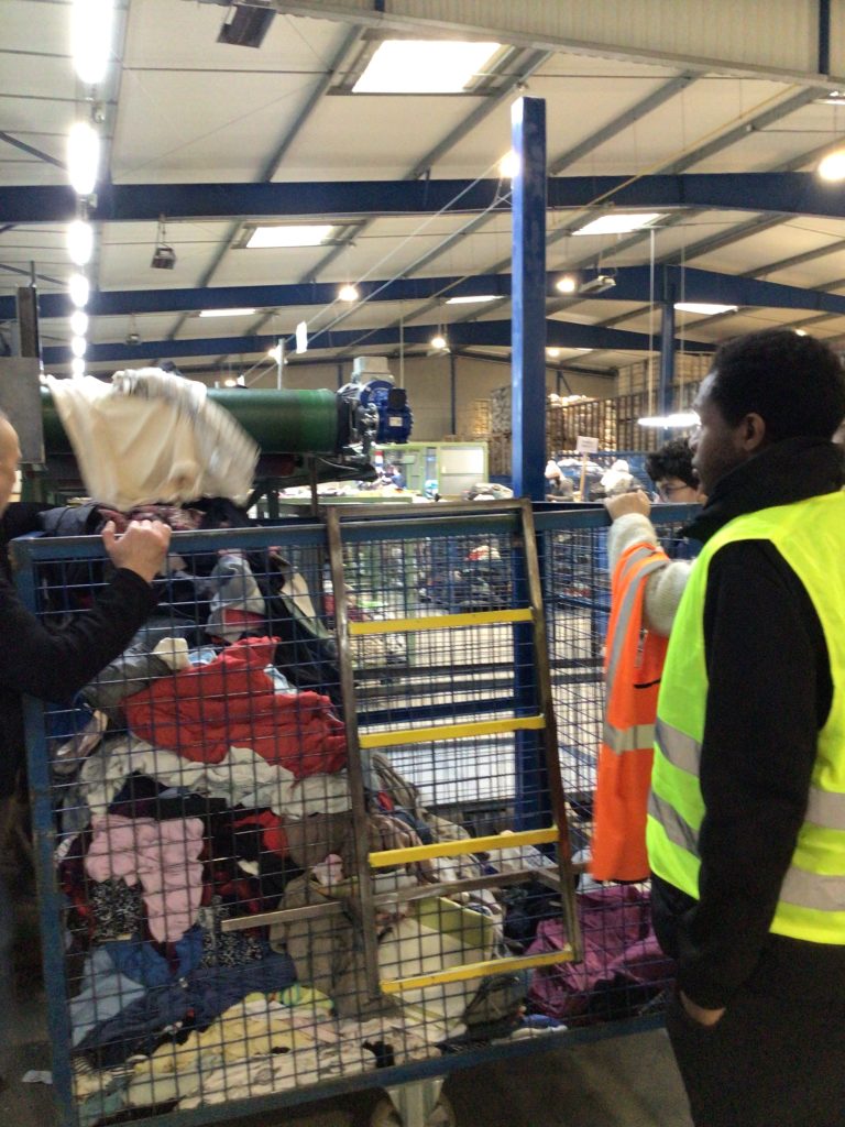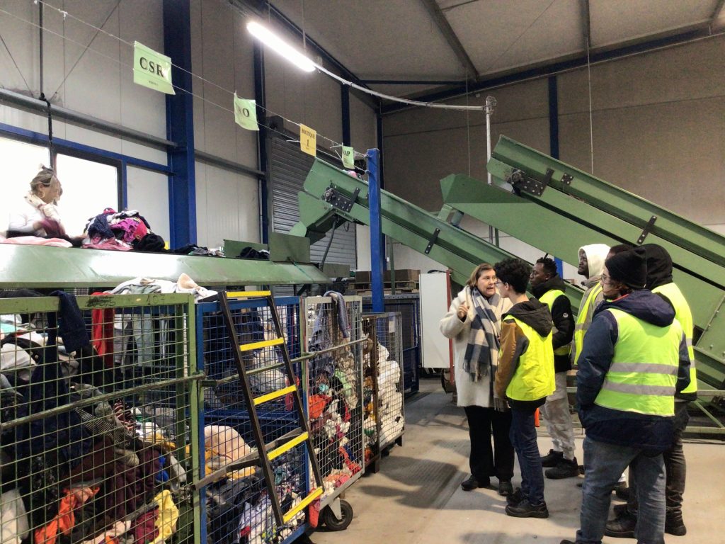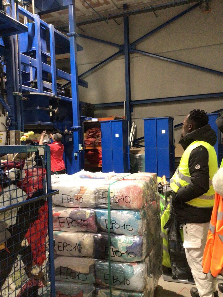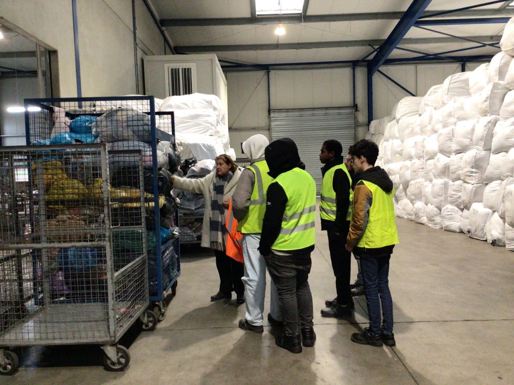 Les élèves ont pu découvrir le centre de tri des textiles : la réception des sacs issus de la collecte des textiles des particuliers dans les bornes de vêtements, l’ouverture des sacs de dons, le tri des chaussures, le tri des vêtements selon leur qualité, la transformation de certains textiles en chiffons, le conditionnement des textiles en balles de vêtements pouvant peser jusqu’à 500kg !