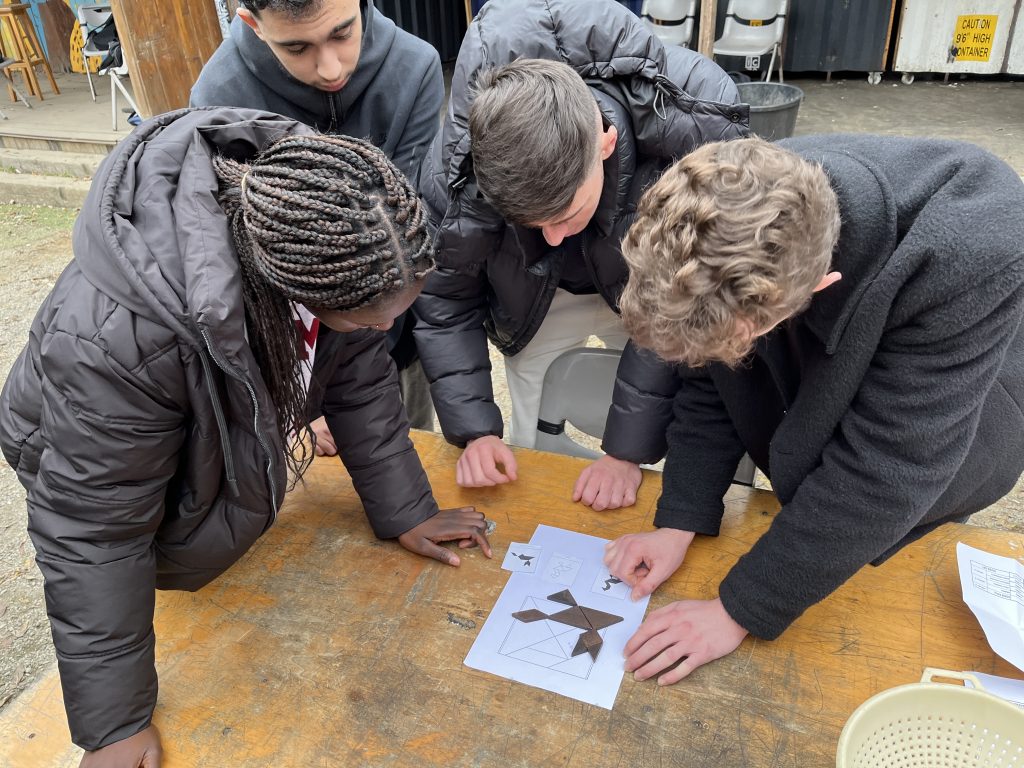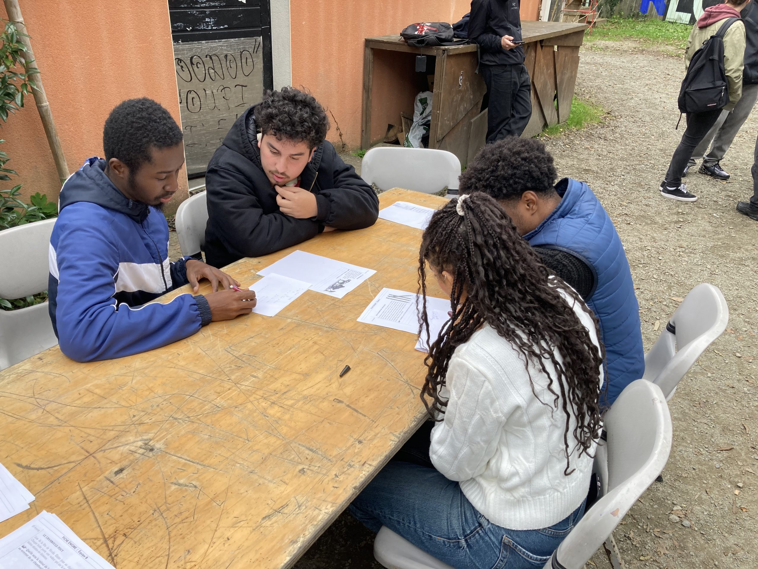 Au programme : le jeu de palets vendéens, le chamboule-prof (une version personnalisée du chamboule-tout avec des photos des enseignants), le tangram (reproduire des formes en équipe), ainsi qu’un défi plus cérébral inspiré du « Certificat d’Études » de niveau 3ème. À la surprise générale, certaines questions, apparemment simples, se sont révélées plus complexes que prévu.