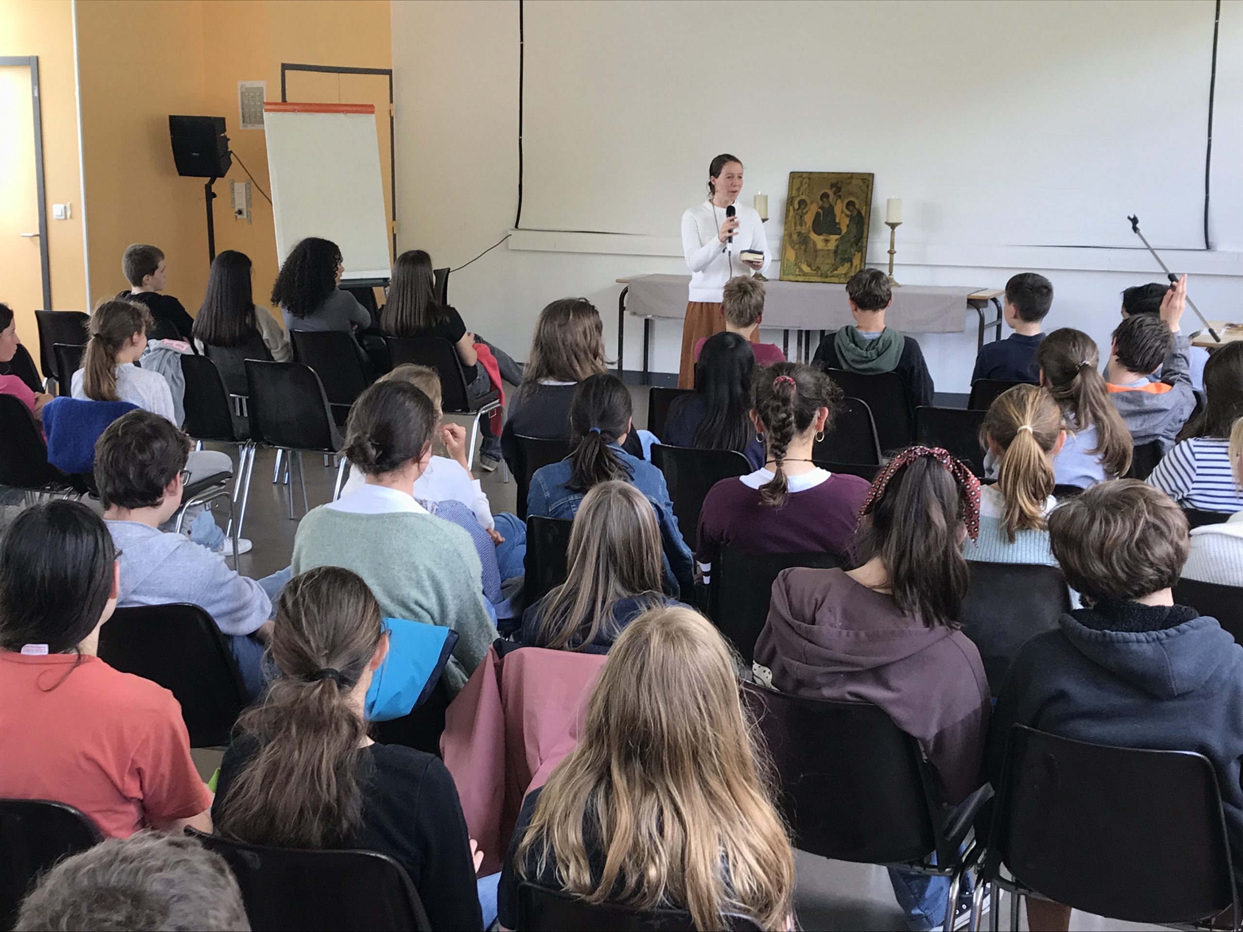 Le samedi soir, notre collègue enseignante au lycée, Caroline VILLORDIN, est spécialement venue de Nantes avec sa guitare pour animer une magnifique veillée de prière et de réconciliation qui a permis à un grand nombre de jeunes de se laisser toucher par l’Amour de Dieu.