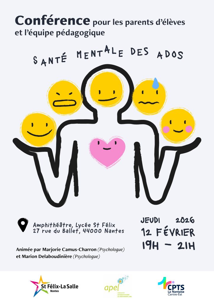 L’Association des Parents d’Élèves a le plaisir de vous inviter à une conférence consacrée à la santé mentale des adolescents, un sujet essentiel au cœur des préoccupations éducatives et familiales actuelles.